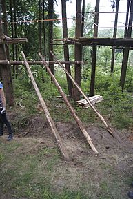 Als Raster werden zunächst 3 Balken (Anzahl der Balken hängt von der Breite des Aufgangs ab) in einem Abstand von ca. 75cm montiert. Anschließend werden senkrechte Balken am Fuß des Aufganges angebracht, an denen später auch das Geländer befestigt wird. Auf das Gerüst werden Planken genagelt. Um die Rutschgefahr zu minimieren werden auf den fertigen Boden weitere Planken in einem Abstand von ca. 40cm genagelt. Aufgrund der Bodennähe kann ein einfaches Geländer ausreichend sein.
