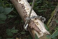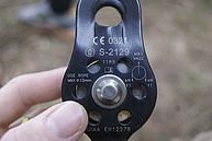 Bei schwerden Balken kann ein Flaschenzug (mit Doppelrolle) für den Transport verwendet werden. Der Balken wird zusätzlich zur Reepschnurr-Vorfixierung mit einer Schwerlastschlinge am Baum gesichert.