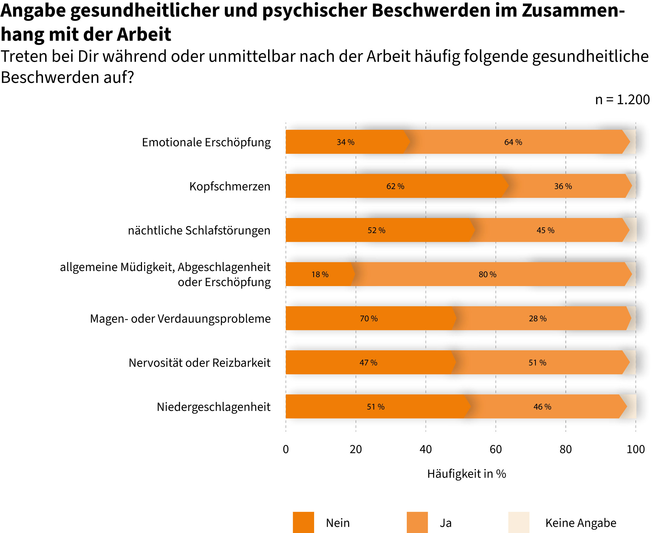 Auch psychosomatische Beschwerden treten überdurchschnittlich häufig auf. Besonders verbreitet sind Müdigkeit und Erschöpfung (80 %), emotionale Erschöpfung (64 %), Schlafstörungen (45 %) sowie Niedergeschlagenheit und Reizbarkeit. Die Werte liegen deutlich über den Vergleichswerten anderer Berufsgruppen und auch über denen der Sozialarbeit insgesamt.